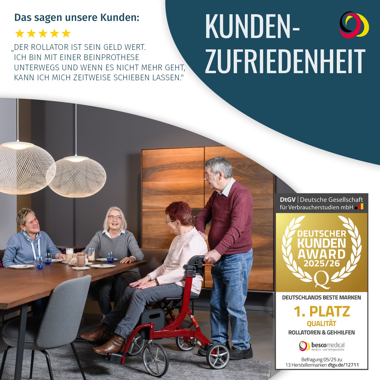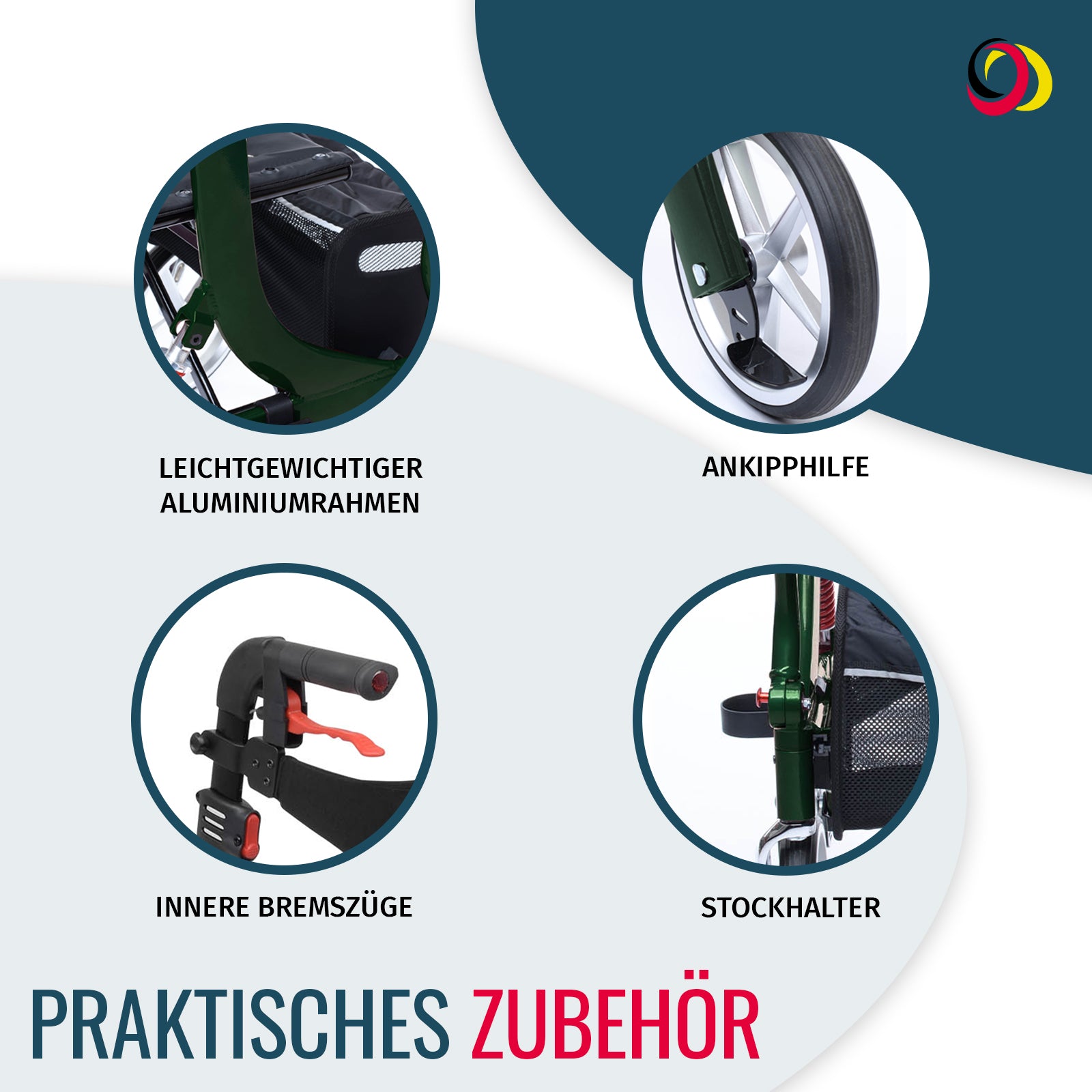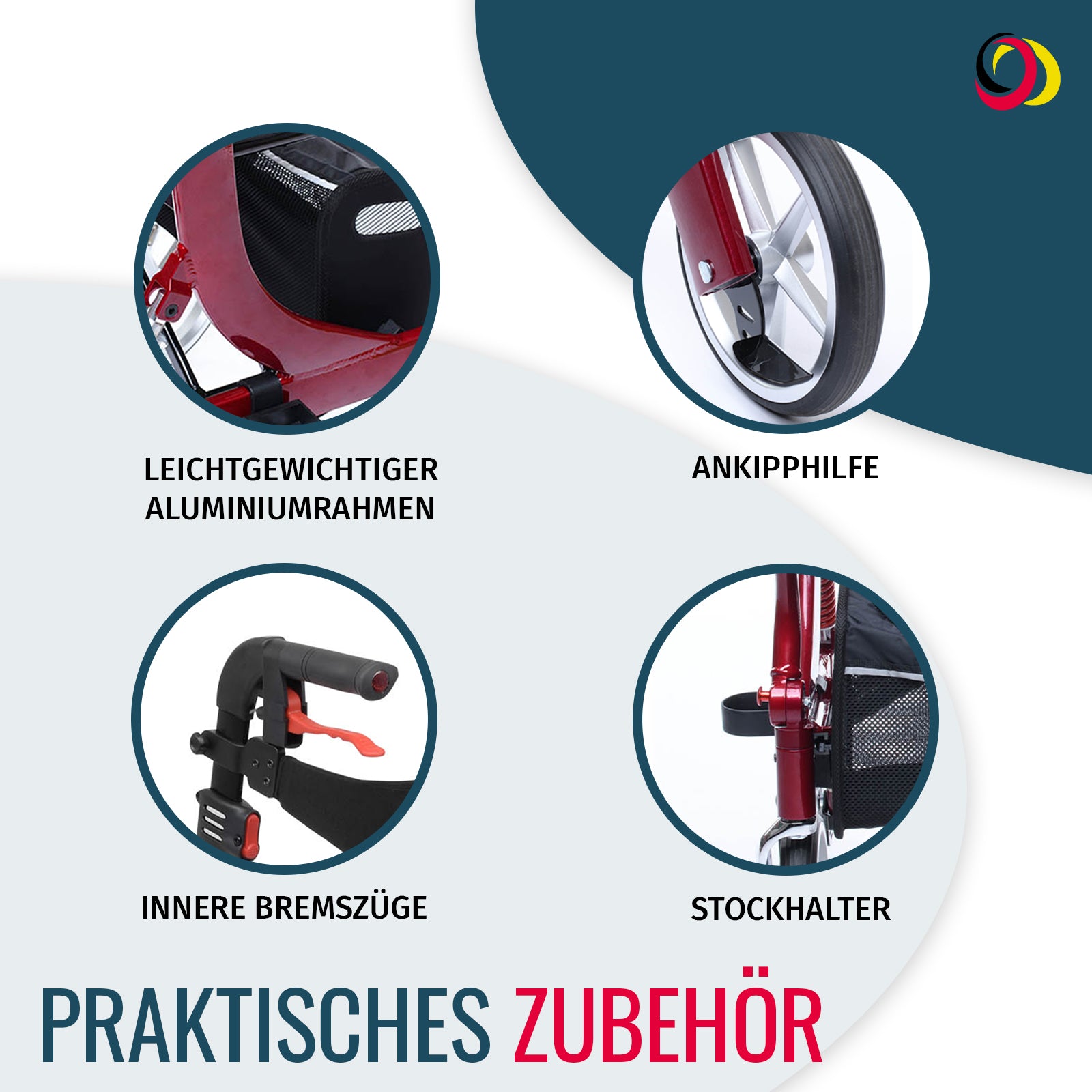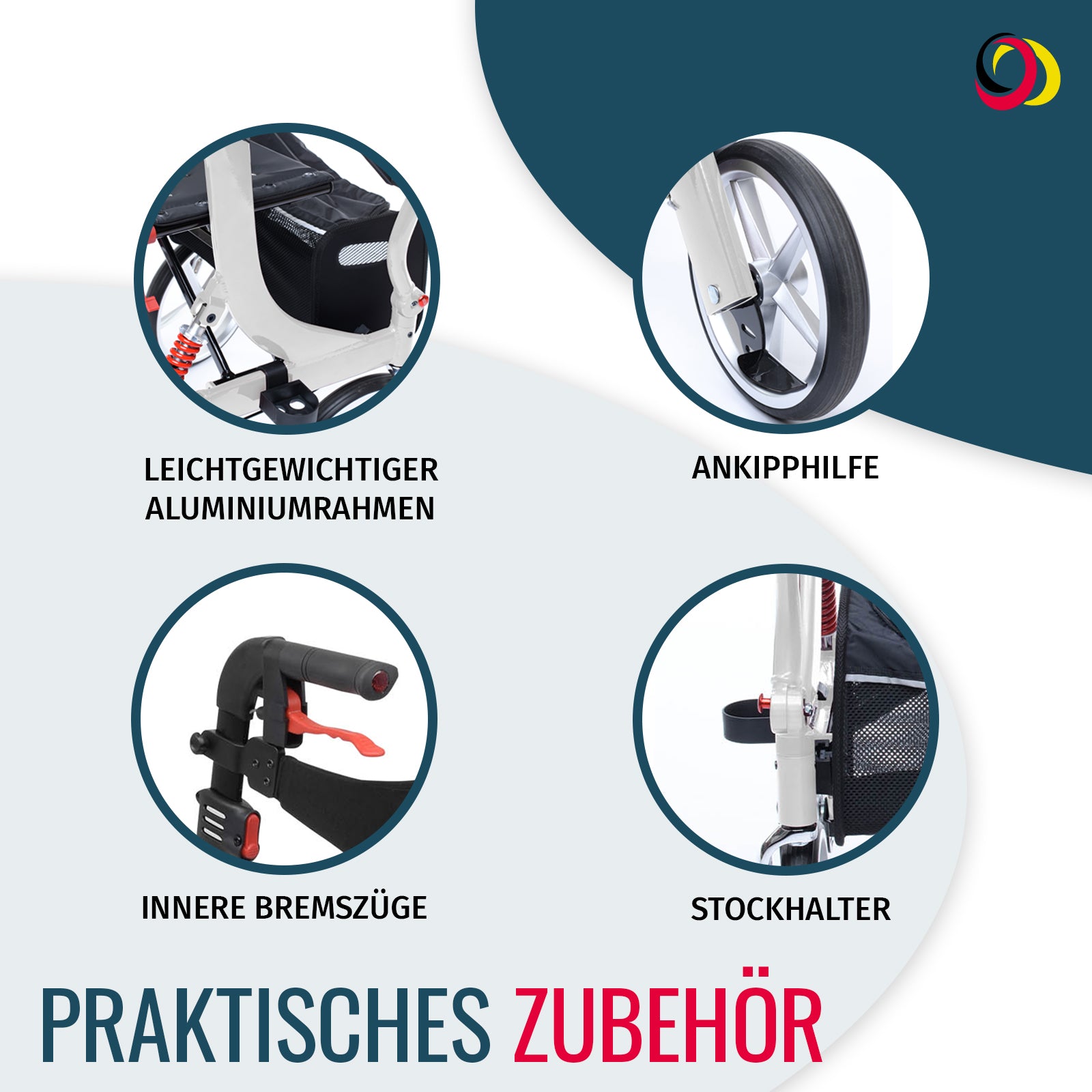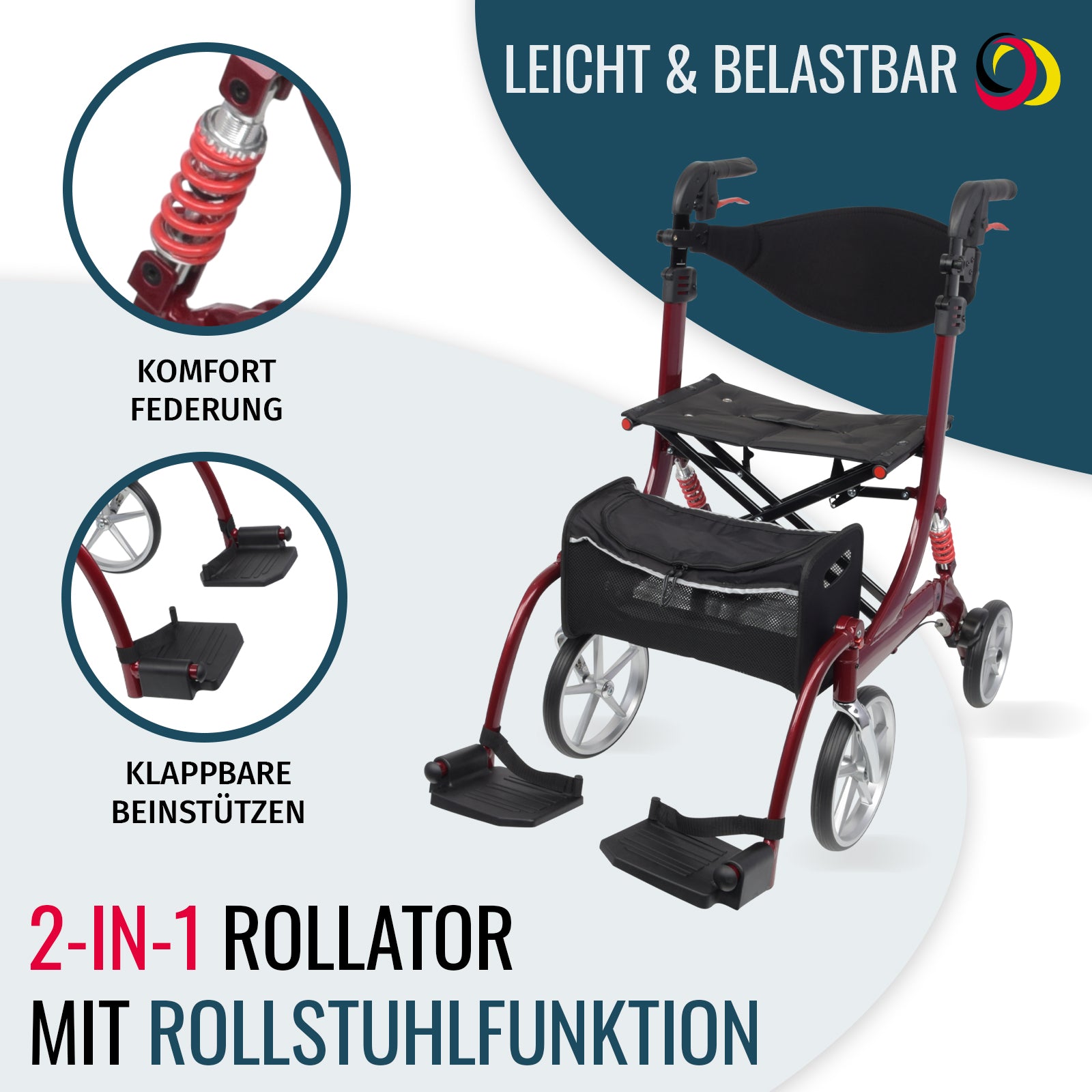 Die Rollator-Rollstuhl-Kombination basiert auf dem Modell SPRING von Besco Medical und verfügt daher über die selben hervorragenden Eigenschaften. Neben der markanten roten Feder, die für ein besonders angenehmes Fahrgefühl sorgt, überzeugen auch die Einkaufstache, Ankipphilfen, Reflektoren und Bremsen, die ihn zum idealen Rollator für unterwegs machen.